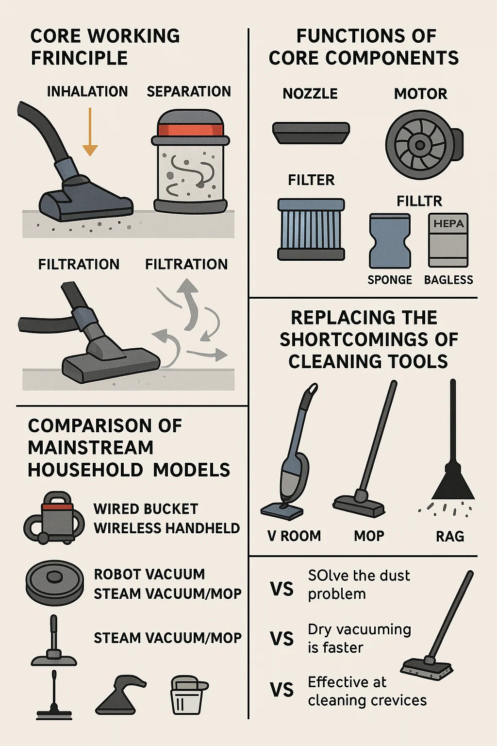 Kluczowe operacje: ▶ Wdychanie - silnik obraca się, tworząc obszar niskiego ciśnienia. Powietrze, niosąc kurz, wpada do dyszy ssącej; ▶ Separacja - mieszanka pyłu wiruje w koszu na kurz, powodując, że ciężkie cząsteczki wpadają do pudełka na pobór pyłu; ▶ Filtracja - drobny pył jest uwięziony przez filtr, a czyste powietrze jest rozładowywane z tyłu.